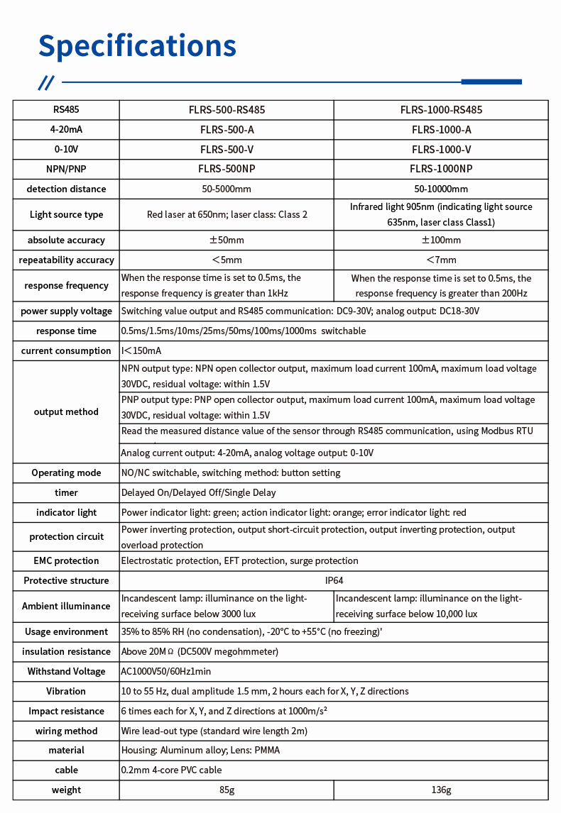 Dibina dengan perlindungan pelbagai lapisan-termasuk perlindungan elektrostatik, EFT, dan lonjakan-siri FLRS melindungi peralatan anda dan meningkatkan keselamatan operasi. Reka bentuk pengukuran dan kawalan bersepadu yang kompak, meminimumkan keperluan ruang dan mengurangkan kerumitan pendawaian, menawarkan kedua -dua kecekapan dan kemudahan pemasangan. Pilih dari model seperti FLRS-1000-RS485 (50-10,000 mm) atau FLRS-500-RS485 (50-5,000 mm) untuk memenuhi keperluan julat khusus anda.