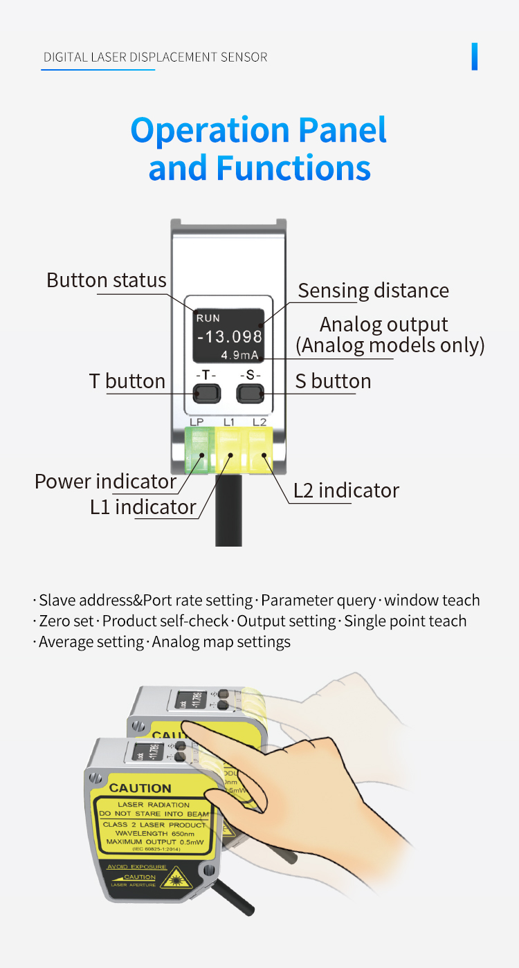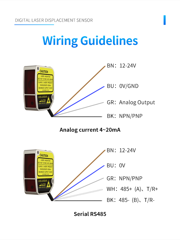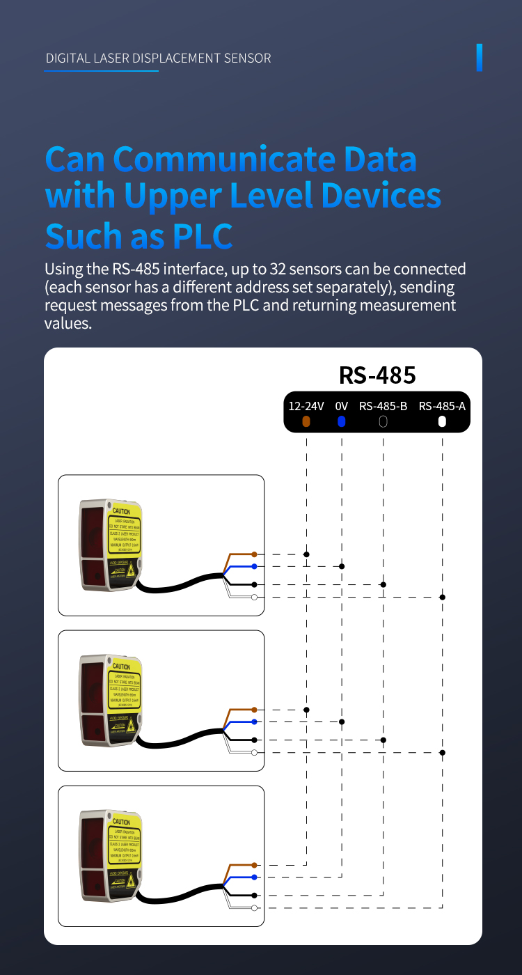 Menggunakan antara muka RS-485, sehingga 32 penderia boleh disambungkan (setiap penderia mempunyai set alamat berbeza secara berasingan), menghantar mesej permintaan daripada PLC dan mengembalikan nilai ukuran.