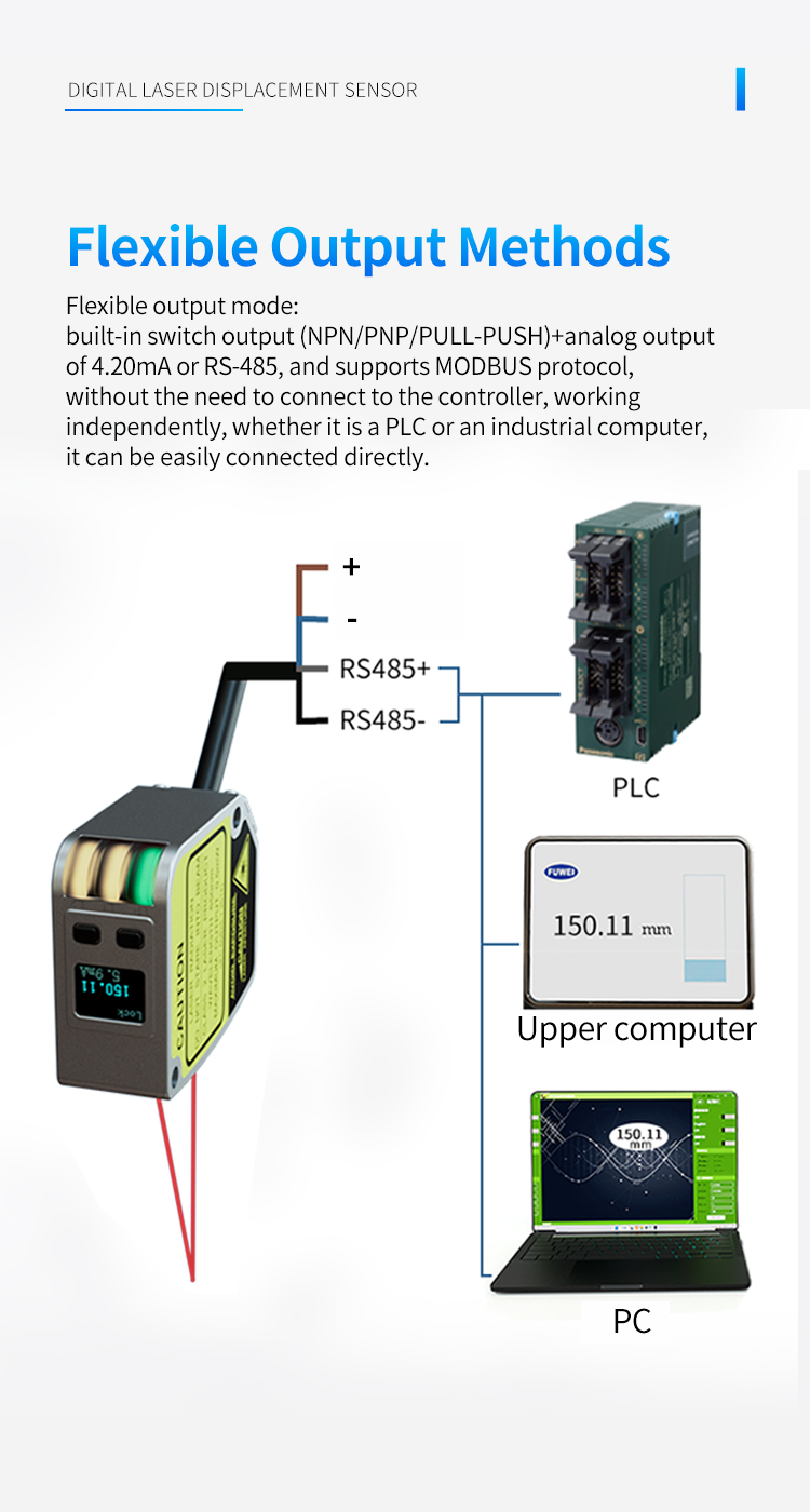 Mod keluaran fleksibel: keluaran suis terbina dalam (NPN/PNP/PULL-PUSH)+output analog 4.20mA atau RS-485, dan menyokong protokol MODBUS, tanpa perlu menyambung ke pengawal, bekerja secara bebas, sama ada PLC atau komputer industri, ia boleh disambungkan terus dengan mudah.