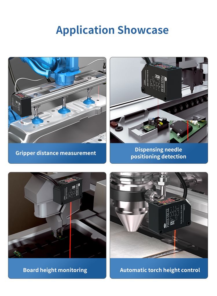 Sensor tradisional sering dipaksa untuk menyesuaikan pelbagai model peralatan kerana julat sempit (seperti julat pengesanan 30mm tetap), mengakibatkan lonjakan kos penggunaan talian pengeluaran. Sensor perpindahan laser siri FSD23, bagaimanapun, menyedari julat pengesanan yang boleh laras 10mm hingga 250mm melalui teknologi fokus dinamik modul yang dibangunkan sendiri, yang sesuai untuk semua senario dari micron cip soldering sendi ke jurang logam automotif.