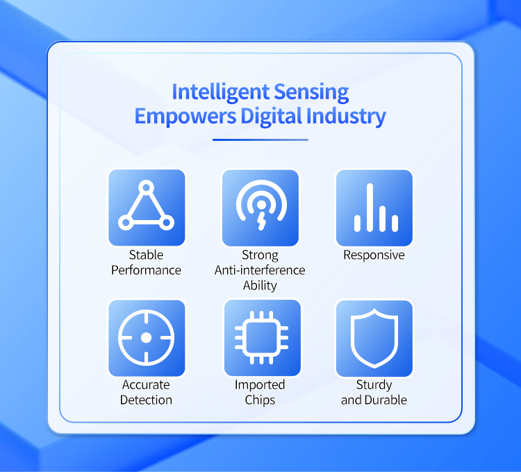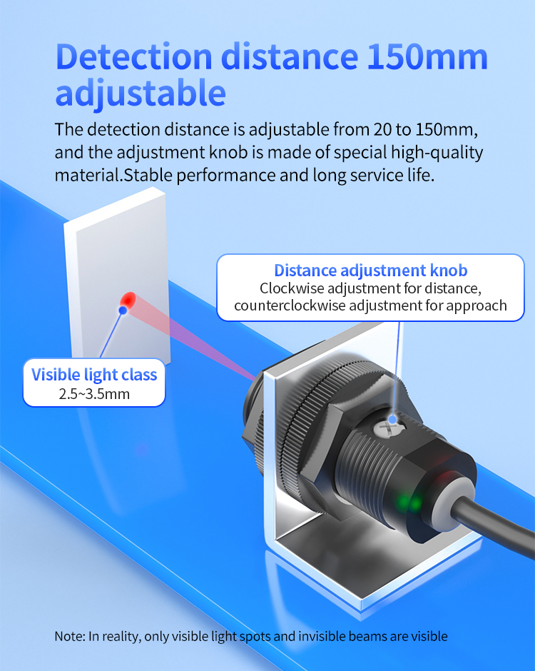 Siri ini menyokong pelarasan jarak pengesanan dari 20 hingga 150mm. Tombol pelarasannya, yang dibuat dari bahan premium, menawarkan operasi yang lancar dan kedudukan yang tepat, mengekalkan prestasi yang stabil walaupun dalam persekitaran penggunaan frekuensi tinggi. Sama ada mengesan mata air kecil atau komponen yang lebih besar, pengguna boleh mencapai tetapan yang tepat melalui pelarasan mudah, dengan ketara meningkatkan kesesuaian dan fleksibiliti sensor untuk aplikasi mesin musim bunga.