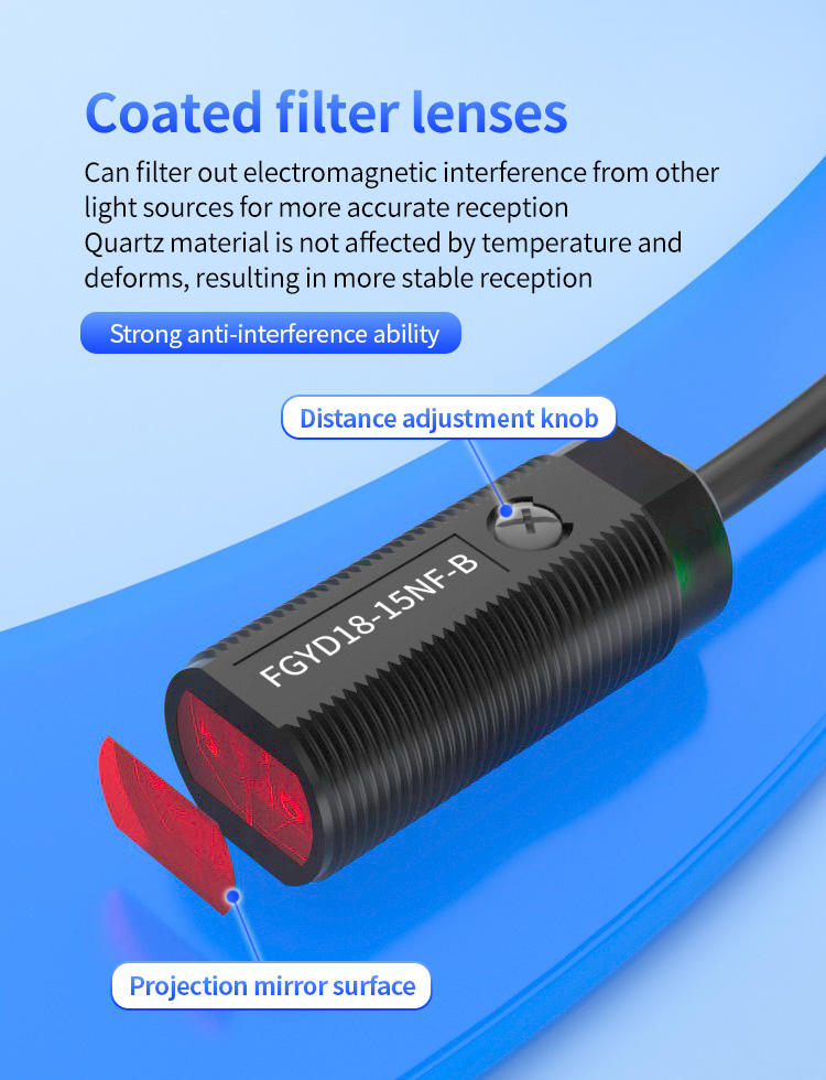 Sensor reflektif tradisional mengalami mengurangkan jarak pengesanan yang ketara apabila merasakan objek gelap (mis., Plastik hitam). Siri FGYD18 menggunakan teknologi penindasan latar belakang, mengekalkan jarak pengesanan yang hampir konsisten merentasi objek pelbagai warna. Ciri ini secara substansial meningkatkan ketepatan pengesanan, mengurangkan kadar yang salah, dan memastikan prestasi cemerlang dalam aplikasi yang kompleks.