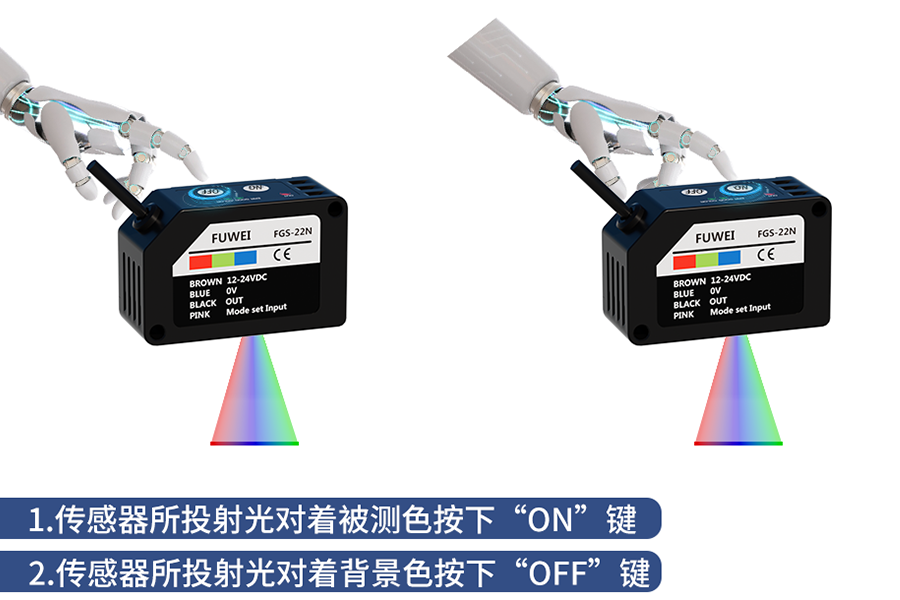 Mod Warna Ketepatan Tinggi: Tukar kepada mod ini apabila anda memerlukan pembezaan perbezaan warna yang sangat halus. FGS-22 secara serentak menerangi LED warna utama R (Merah), G (Hijau), dan B (Biru). Ia mengenal pasti warna dengan menganalisis nisbah tepat warna RGB dalam cahaya yang dipantulkan daripada objek. Teknologi penderia warna termaju ini berkesan mengatasi gangguan cahaya ambien dan variasi tekstur permukaan, mencapai pengenalpastian warna kompleks yang sangat boleh dipercayai. Ia sesuai untuk aplikasi berketepatan tinggi seperti penggredan kualiti produk dan pemeriksaan perbezaan warna cat.