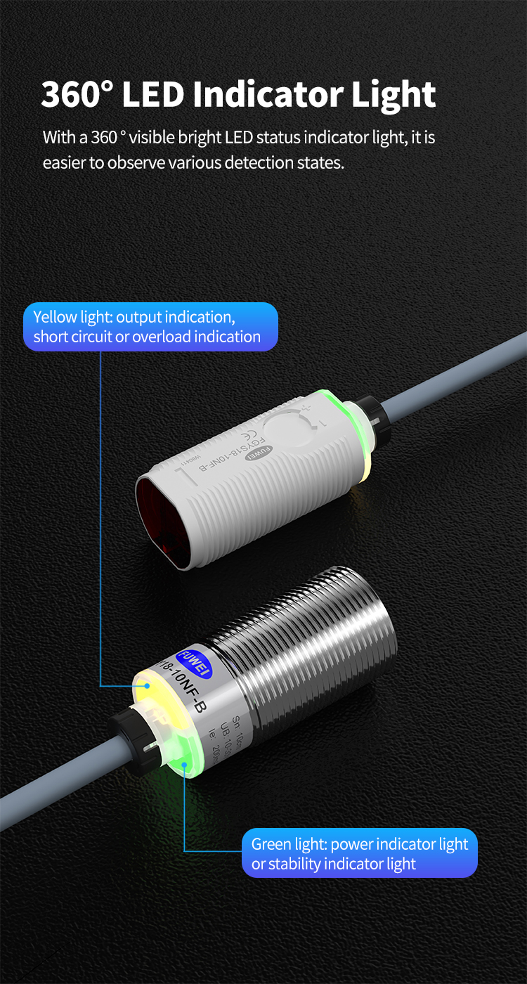 FGY18-10NU-B mempunyai penunjuk status LED yang terang, 360 °. Pengendali dengan mudah boleh memantau status operasi sensor dari mana -mana sudut. Reka bentuk ini secara signifikan memudahkan pemantauan masa nyata dan debug untuk pengendali mesin CNC, mengurangkan downtime yang disebabkan oleh petunjuk status yang tidak jelas dan meningkatkan kecekapan pengeluaran.