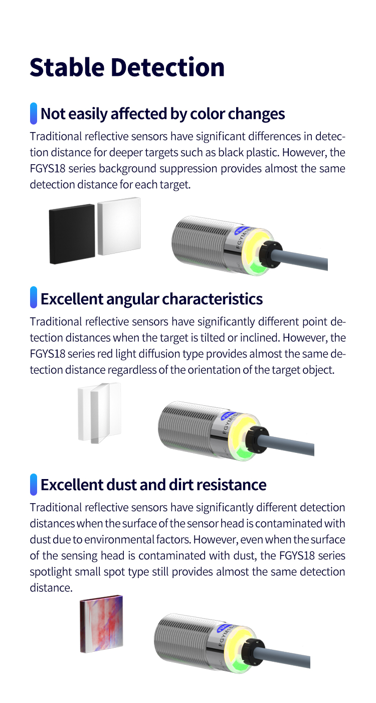 Sensor tradisional sering gagal mengesan objek kerana variasi warna atau bahan. FGY18-10NU-B menggunakan reka bentuk optik canggih untuk mencapai pengesanan objek yang stabil tanpa mengira warna atau bahan. Sama ada mengesan bahagian logam, bahan kerja plastik, atau bahan berwarna gelap semasa pemesinan CNC, ia mengekalkan kepekaan yang konsisten, memastikan proses pengeluaran yang lancar dan tepat.